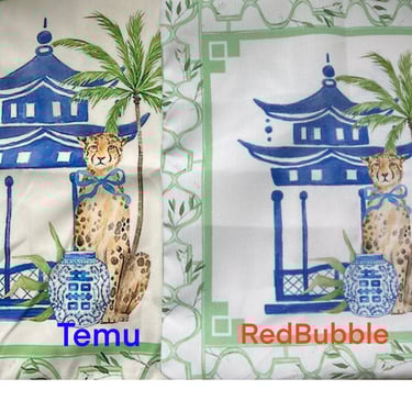 A side-by-side comparison of RedBubble and Temu pillow covers featuring my mom’s stolen design. Stitching, fabric quality, and print sharpness reveal a surprising reality.
